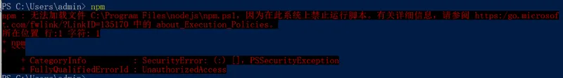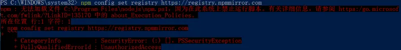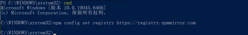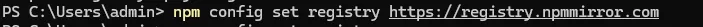 node 安装成功后,在 powershell 中使用命令npm config set registry https://registry.npmmirror.com将 npm 的源换成国内源。