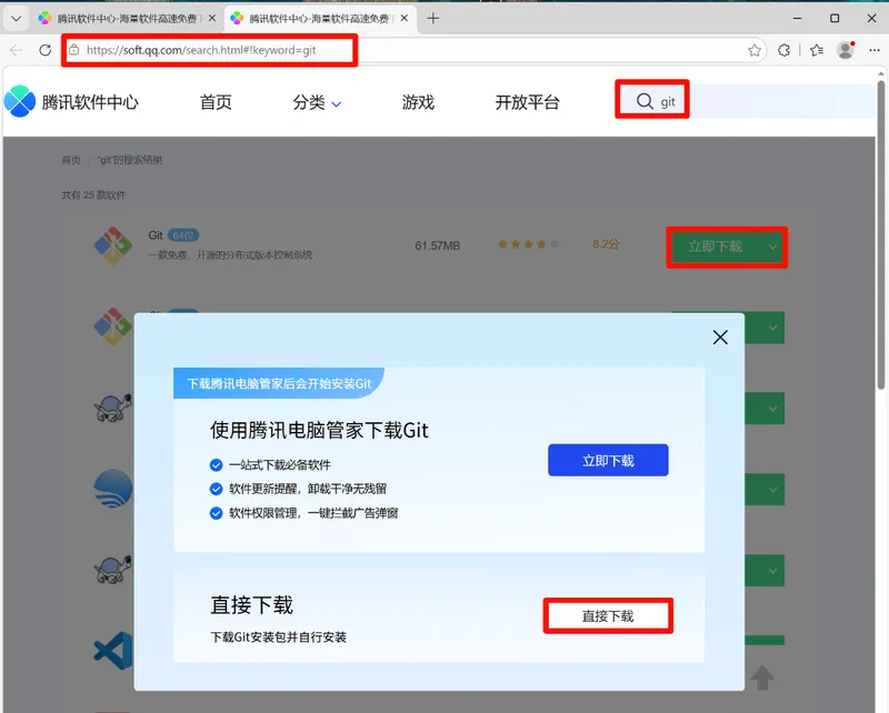 git 下载地址,在 soft.qq.com 上搜索 git 并下载
