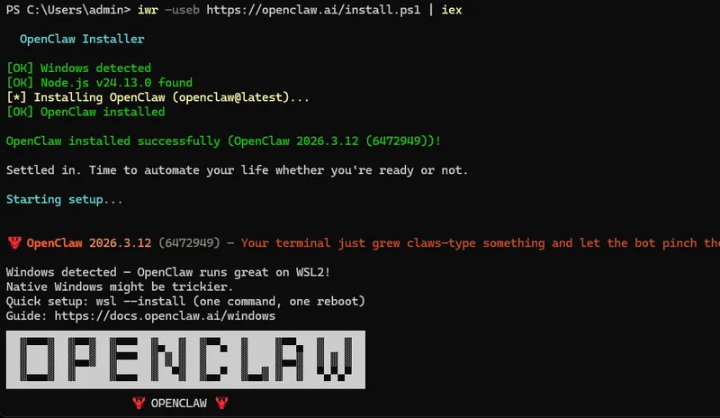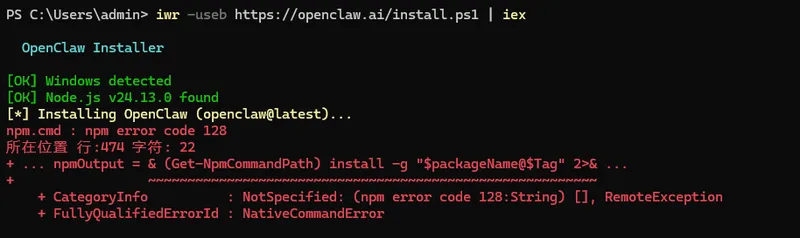 目前 openclaw 官网提供了两种命令来在 Windows 上安装,分别是 cmd 跟 powershell,我们这里使用 powershell 的方式来进行。之后再打开的应用中输入命令iwr -useb https://openclaw.ai/install.ps1 | iex来进行安装。
