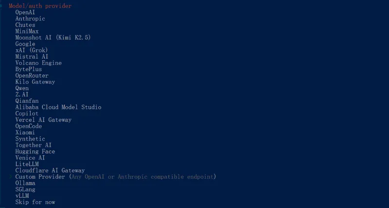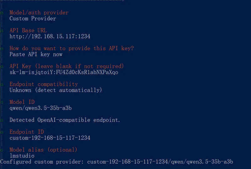 如果你之前已经配置了其他模型或者选择了跳过,这里你可以使用命令来将lmstudio作为openclaw的模型提供商
