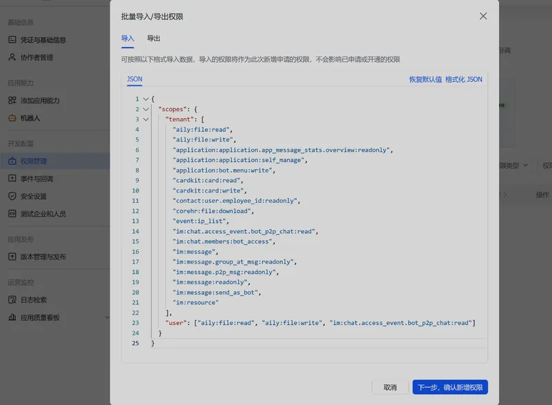 1 2 3 4 5 6 7 8 9 10 11 12 13 14 15 16 17 18 19 20 21 22 23 24 25 26 27 28 29 { "scopes": { "tenant": [ "aily:file:read", "aily:file:write", "application:application.app_message_stats.overview:readonly", "application:application:self_manage", "application:bot.menu:write", "cardkit:card:read", "cardkit:card:write", "contact:user.employee_id:readonly", "corehr:file:download", "event:ip_list", "im:chat.access_event.bot_p2p_chat:read", "im:chat.members:bot_access", "im:message", "im:message.group_at_msg:readonly", "im:message.p2p_msg:readonly", "im:message:readonly", "im:message:send_as_bot", "im:resource" ], "user": [ "aily:file:read", "aily:file:write", "im:chat.access_event.bot_p2p_chat:read" ] }}