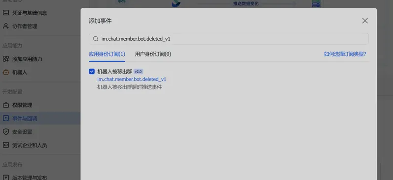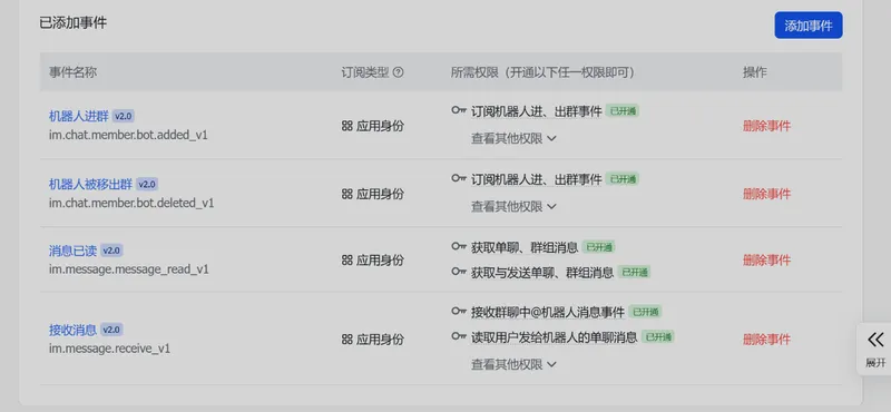 • im.message.receive_v1- 接收消息 • im.message.message_read_v1- 消息已读回执 • im.chat.member.bot.added_v1- 机器人进群 • im.chat.member.bot.deleted_v1- 机器人被移出群