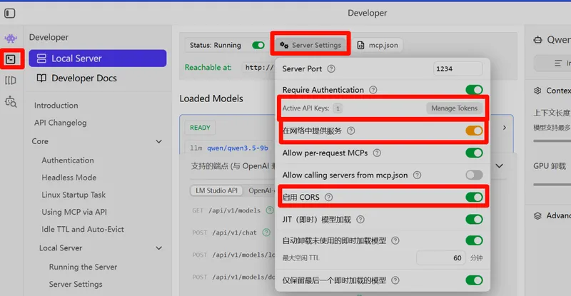• api key 配置:在 Manage Tokens 中来进行,根据情况来选择,如果不配置就可以使用任意字符代替 • 在网络中提供服务:如果你的 openclaw 跟 lmstudio 运行在不同的设置上需要开启此选项 • 启用 CORS:建议开启 • JIT (即时)模型加载:如果你有多个模型并给不同的应用使用可以考虑开启该功能,可以让应用调用 api 时自主加载需要的模型 • 自动卸载未使用的即时加载模型与仅保留最后一个即时加载的模型建议开启,可以节约设备性能。