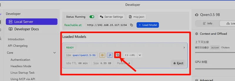 模型 api base url,通过复制获取,但这里的模型地址需要加上/v1 才能在 openclaw 中使用,比如你复制的是http://192.168.15.117:1234你要改成http://192.168.15.117:1234/v1才能使用,这种写法是openai的api接口的兼容模式。