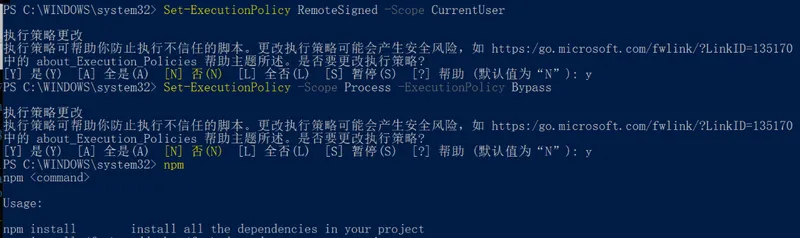 1 2 3 # 允许当前用户运行本地和下载的脚本Set-ExecutionPolicy RemoteSigned -Scope CurrentUserSet-ExecutionPolicy -Scope Process -ExecutionPolicy Bypass