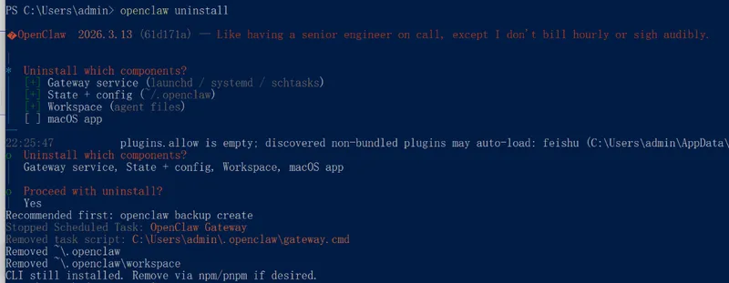 实际上 openclaw 官方提供了卸载命令,你只要在 powershell 中,输入命令openclaw uninstall就可以完成卸载了,你可以打开电脑,找到用户目录下 .openclaw 文件夹,将整个目录删除即可。你完全不用花钱找人上门卸载这玩意儿。