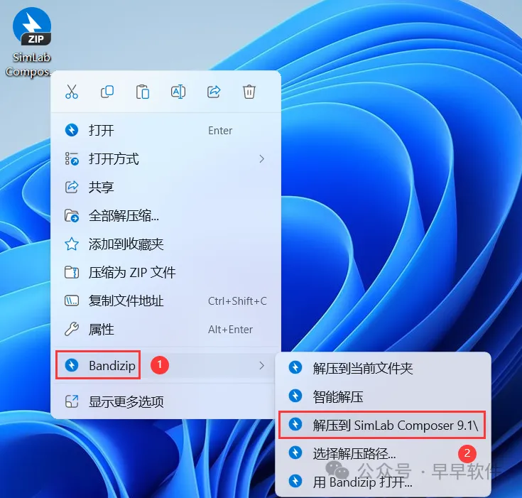 1、下载SimLab Composer 9.1软件安装包到电脑上,右键选择【解压到SimLab Composer 9.1\】