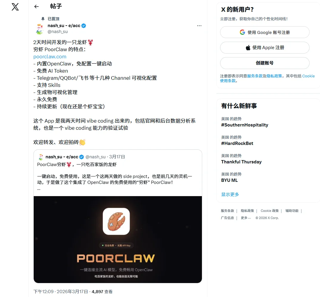 作者在X上发帖子说:只用2天时间Vibe Coding开发的一只龙虾🦞,AI时代人人都是产品经理。