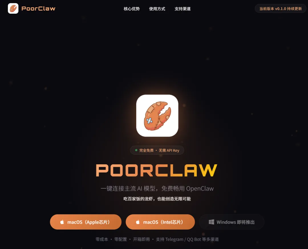 登录官网:https://poorclaw.com ,目前只有macOS系统版本下载!小小建议:既然是“穷虾”,建议尽快推出Windows版本,大众普及率会更高!