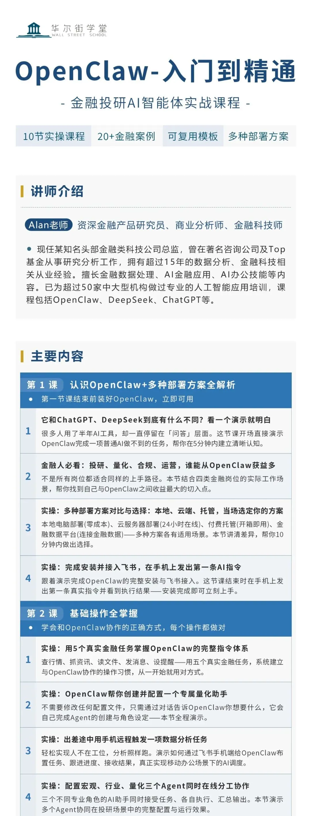 为了让更多的人能够快速使用OpenClaw实操应用,华尔街学堂邀请资深专家开设《OpenClaw-入门到精通》专题课。将结合案例操作演示,手把手带领大家轻松玩转OpenClaw。本课程为金融从业人员量身定制,10节课循序渐进,每节课围绕真实金融案例展开,从零安装到量化回测全链路覆盖,学完当天就能把OpenClaw用进自己的工作流。