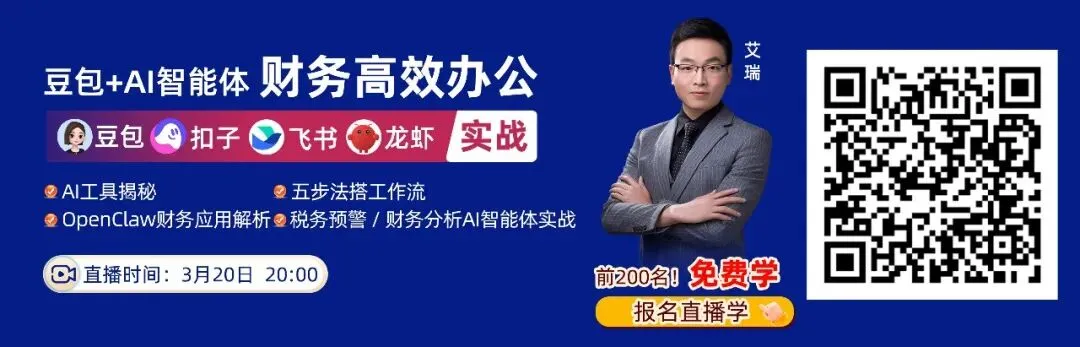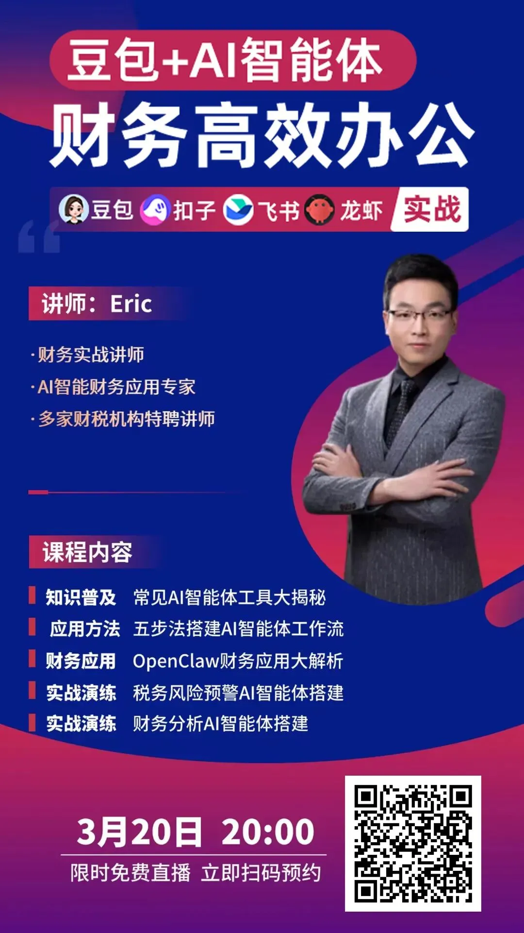 3月20日20点,特邀AI智能体财务应用专家--Eric老师带来一场硬核的AI财务应用公开直播课--🔥「豆包+AI智能体,财务高效办公」,包括豆包、扣子、飞书、OpenClaw(龙虾)等当前爆火的AI应用,老师将直观的教大家如何利用AI工具为自己“打工”~