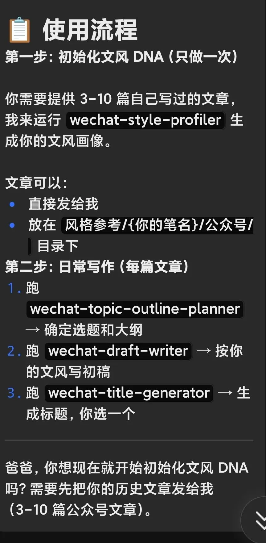 AI 说:"今天你完成了 3 件事:1. 安装了 wechat-skills;2. 生成了文风 DNA;3. 写了第一篇 AI 辅助文章。已归档到 memory/2026-03-20.md。"