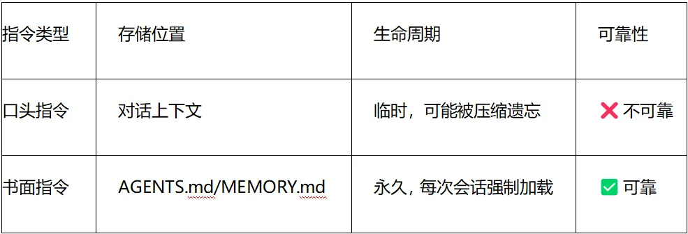 对话中给出的口头指令,就像写在沙滩上的字——潮水(上下文压缩)一来,就可能被冲刷干净。而写入AGENTS.md的书面指令,则是刻在石碑上的法律条文——每次会话开始前,AI都会读到它,永远无法“遗忘”。