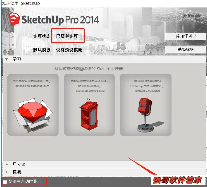 15.软件欢迎界面如下,可以看到许可状态是:已获得许可。点击开始使用SketchUp。