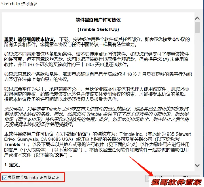 14..勾选“我同意SketchUp许可协议”,然后点击继续