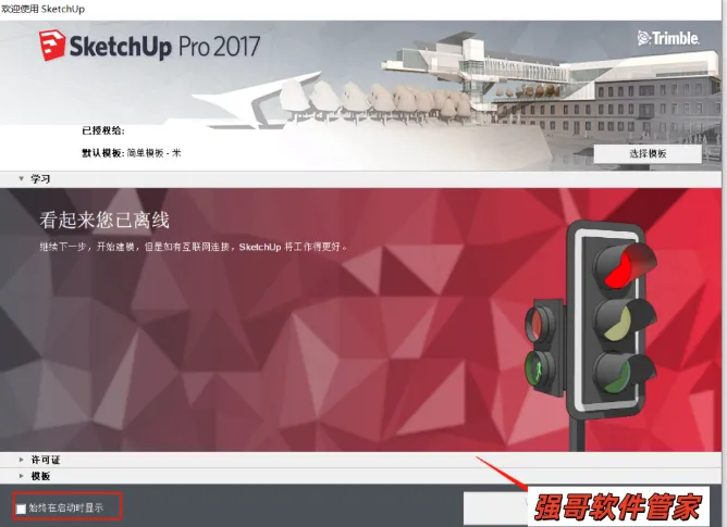 15.软件欢迎界面如下,取消勾选“始终在启动时显示”,点击开始使用SketchUp