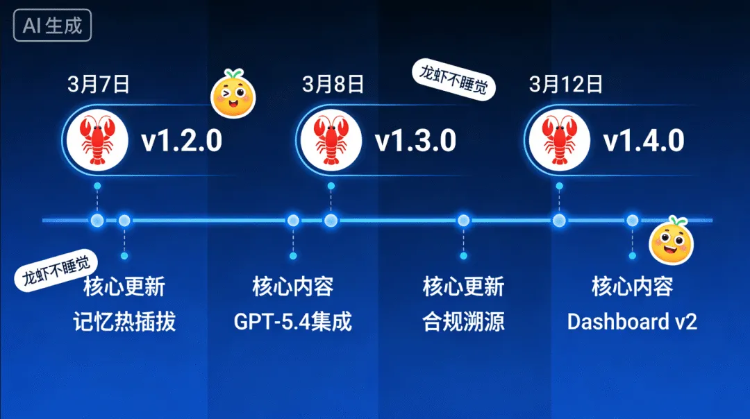 2026 年 3 月,GitHub 星标突破 27.8 万的开源 AI 智能体框架 OpenClaw(外号 "龙虾")上演了一场技术圈的狂欢 ——3 月 7 日至 12 日,连续推出 v2026.3.7、3.8、3.12 三个重磅版本,89 项功能更新、200+Bug 修复、10 + 高危漏洞修补,被 36Kr 评为 "史上最猛更新"。社区用 "龙虾不睡觉" 的表情包调侃开发团队的更新速度,Discord 频道 8900 名成员实时跟进,24 小时内 GitHub Issues 区新增讨论量突破 500 条,创下开源 AI 项目单日互动纪录。
