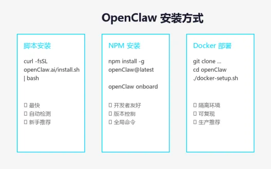 curl -fsSL https://openclaw.ai/install.sh | bash脚本会自动检测你的操作系统、检查 Node.js 版本,然后启动引导向导。如果你不放心直接执行脚本(这是个好习惯),可以先下载下来看看:三种安装方式