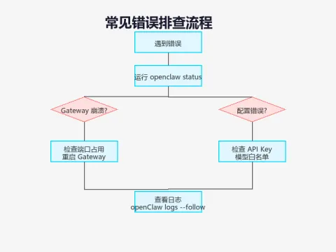 **症状:** Node 用户(UID 1000)没有挂载卷的权限▲ 图2:常见错误排查流程sudo chown -R 1000:1000 ~/.openclaw错误 5:Telegram 机器人在线但不回复