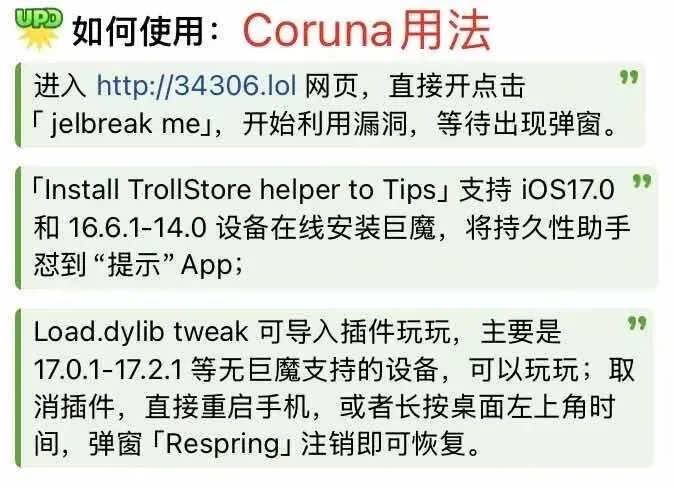 支持 :iOS 13.0 - 17.2.1,内核漏洞,PPL 绕过。主要是指→iOS17.0.1至17.2.1,现在可以用漏洞网页装少量dylib插件