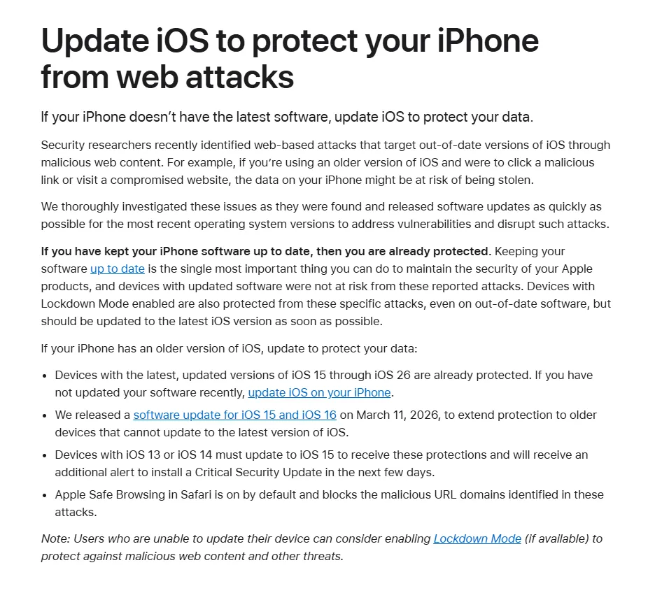 苹果敦促iOS用户更新升级!苹果在一份最新的支持文件指出,那些还在运行iOS 13和iOS 14系统的iPhone用户请尽快升级到最新的iOS 15.8.7系统,以保护自己免受恶意网络内容的黑客攻击。根据文档内容显示,市面上出现了一些针对老版iOS的黑客工具,像“Coruna”和“DarkSword”这两款iOS漏洞利用工具包,它们就像狡猾的小偷,能利用iOS 13到iOS 17.2.1版本中的漏洞,悄无声息地潜入你的手机。早在3月11日,苹果就已经发布了新的iOS 15和iOS 16更新,目的就是为了解决这个安全问题。苹果称,那些还在用iOS 13或iOS 14的设备,必须升级到iOS 15才能获得保护。在接下来的几天里,使用旧版iOS的iPhone用户还会收到安装关键安全更新的额外提醒。除了升级系统,苹果还为用户准备了其他“防护盾”。Safari浏览器里的Apple安全浏览功能默认开启,可以拦截在攻击中被识别的恶意URL域名。iPhone17已经上市,256GB起步,6.3寸更大屏幕,120HZ高刷等良心升级,今年肯定会大卖!如果您家里有闲置手机趁现在高价出掉,很多人把闲置的手机一直放着,最后只能换不绣钢脸盆!(估价满意后再加回收专员:gfzjxm)