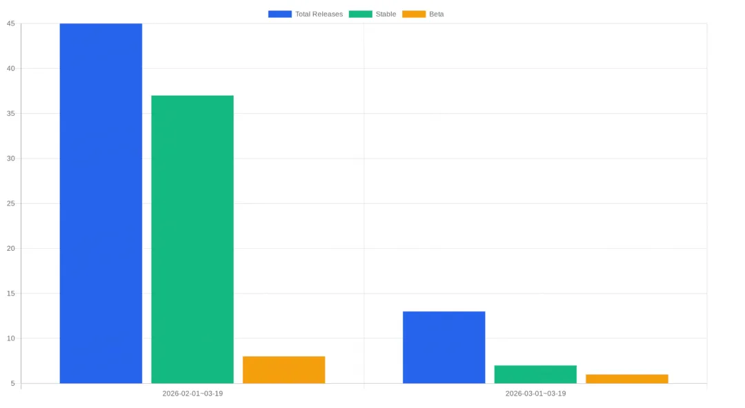 如果只看2026年2月1日到3月19日这段时间,npm 发布节奏更能说明问题:
