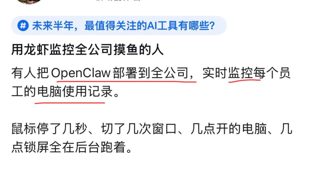 把OpenClaw往全公司一铺,这味儿一下就不对了。表面看是“精细化管理”,实际就是给每个人电脑后面安了个电子监工。鼠标停几秒,切了几次窗口,几点开机,几点锁屏,全给你记着。