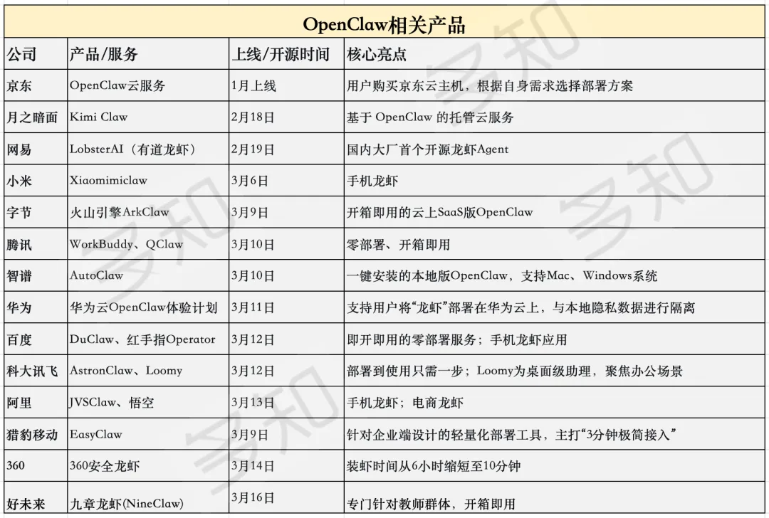 以下为多知整理的各大厂商推出的“龙虾”安装方式: