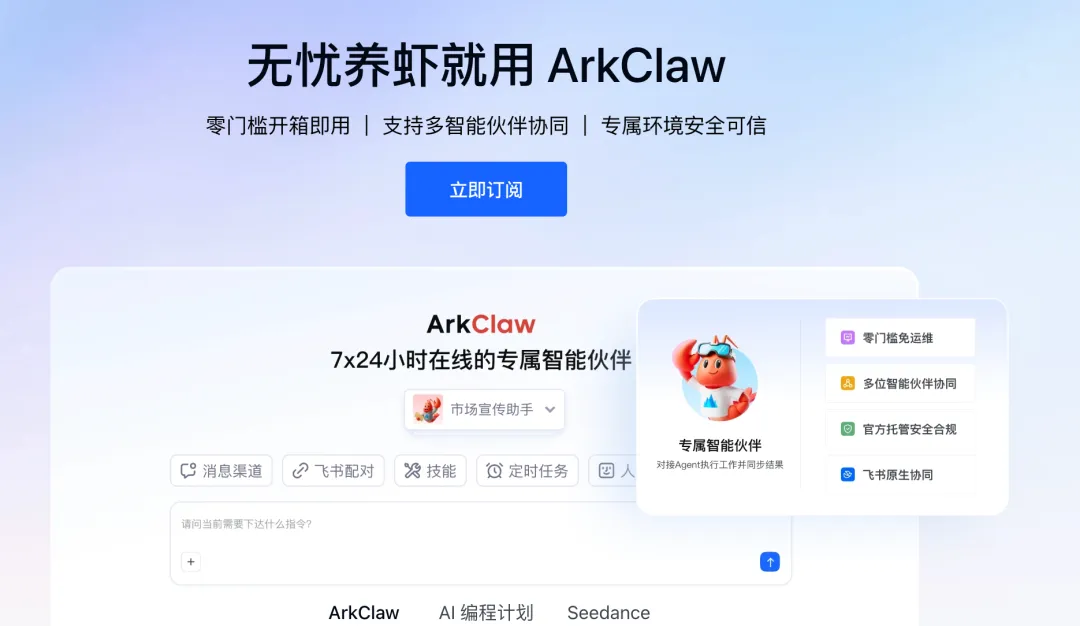 火山引擎正式上线ArkClaw,无需任何复杂配置,打开网页即可使用7×24小时在线的AI助手,轻松养“虾”。