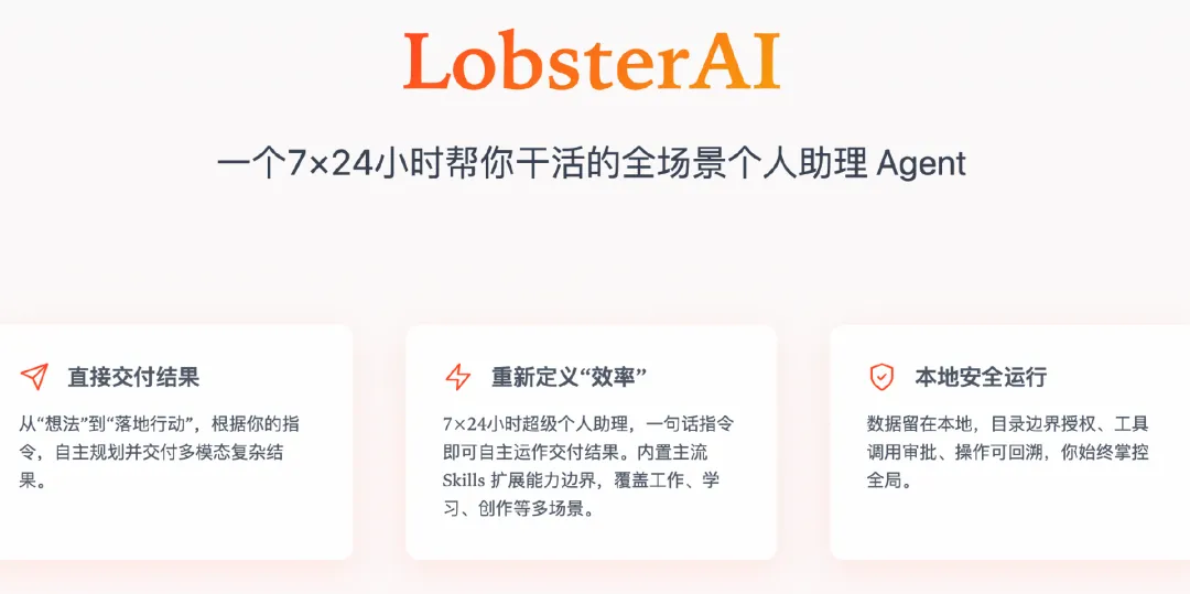 不同于仅提供文字问答的传统 AI 应用,LobsterAI 核心定位为“7×24小时全场景个人助理”。