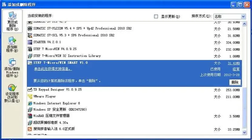 图1.在”添加/删除程序“中选择卸载 STEP 7-Micro/WIN SMART。