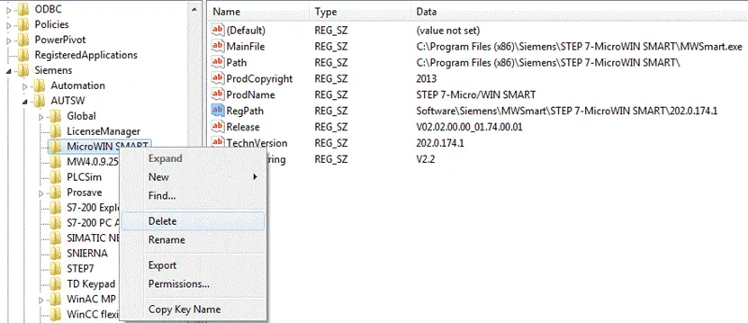 4.删除查找到的和STEP 7-Micro/WIN SMART相关的注册表条目