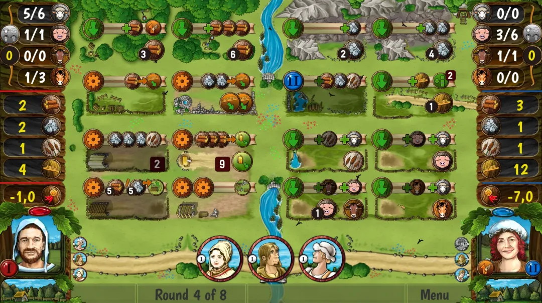 在本作中,无法增加家族成员,也就是说游戏过程中始终为3名农夫(worker)。游戏一共有8个回合,每个回合类似农场主,先补版图上的资源,然后大家轮流放自己的农夫占据行动版。