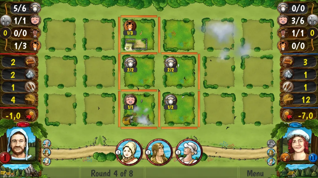 每轮结束的时候,如果某种动物有两只以上则会生出一只,然后进入下一回合,继续补充版图上的资源和放农夫执行行动。八个回合后,开始计分。