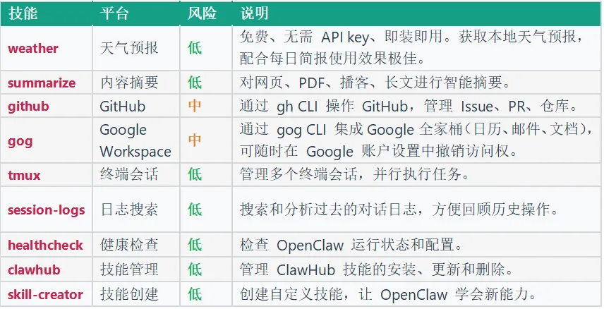 OpenClaw官方内置的53个技能经过安全审核,覆盖办公、开发、生活、社交等全场景。如果你刚开始接触OpenClaw,推荐安装以下技能,然后再慢慢探索生态循序渐进。