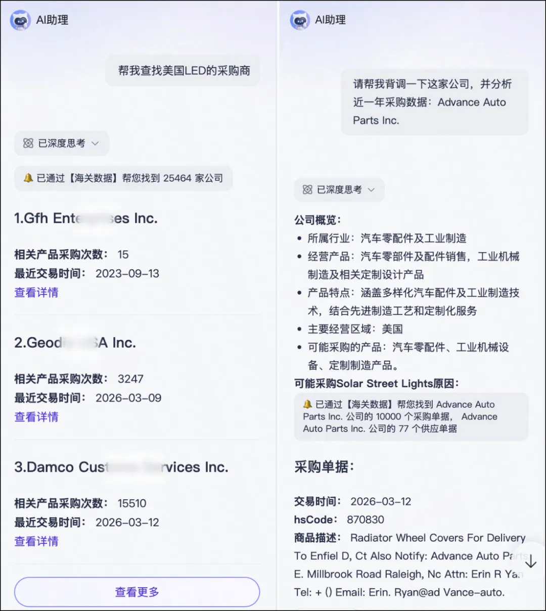 还在为日常找更多潜客耗费大量时间吗?现在只需对「AI助理」下达一句指令:“帮我挖掘美国地区家居用品采购商,要求一年内有采购记录”,它会在网易外贸通10+获客渠道,自动挖掘精准客户,同时会剔除资质不符、邮箱错误等无效信息,自动将匹配度高、有购买样品等动作的活跃采购商推给你。一旦目标客户海关数据出现同行被替换或发现新动向,AI会立刻通知,让你快人一步把握谈单机会。