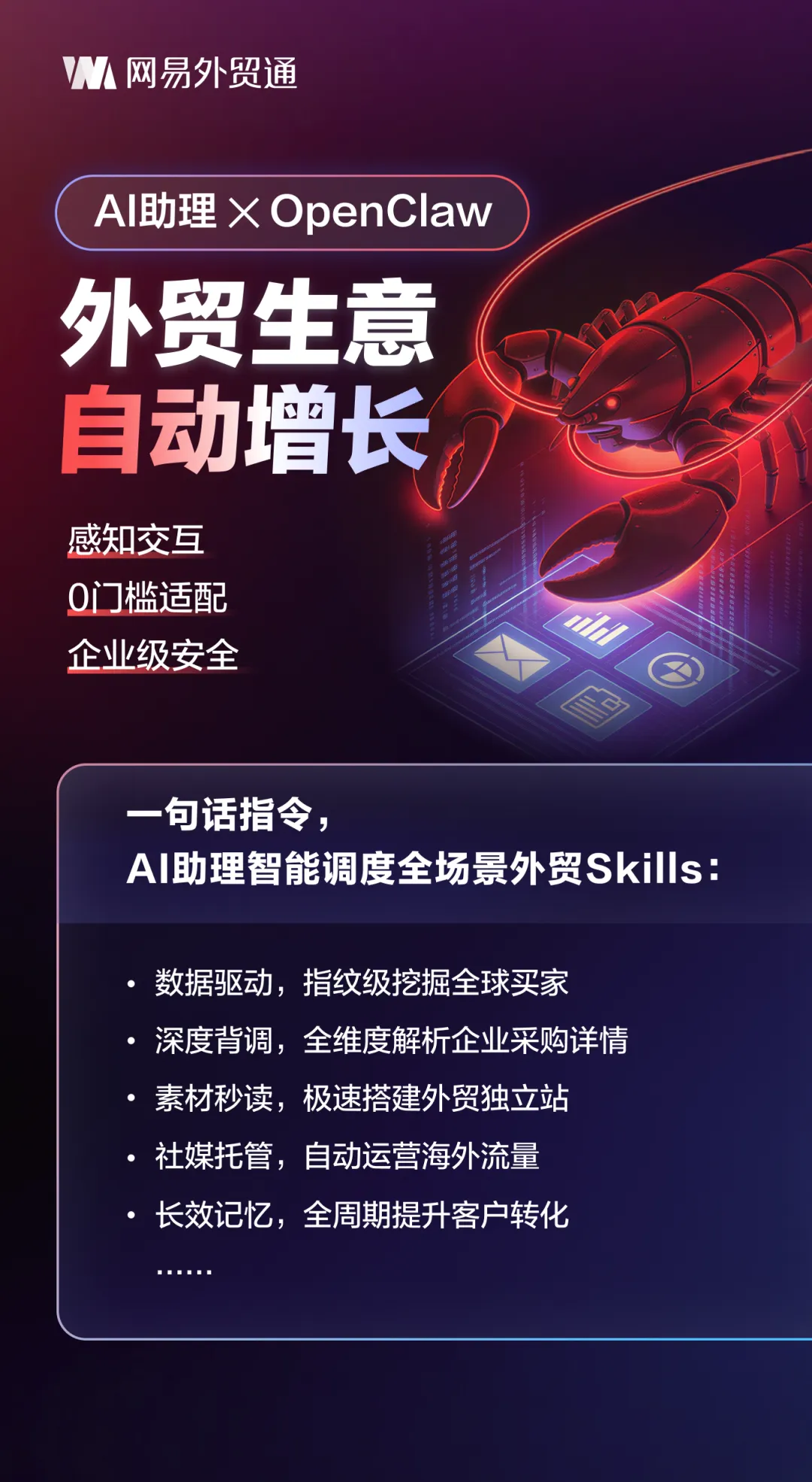 为贴合客户需求和优化使用体验,网易外贸通「AI助理」依托OpenClaw智能体,深度赋能外贸生意全流程,助力外贸企业在全球市场中抢占先机。