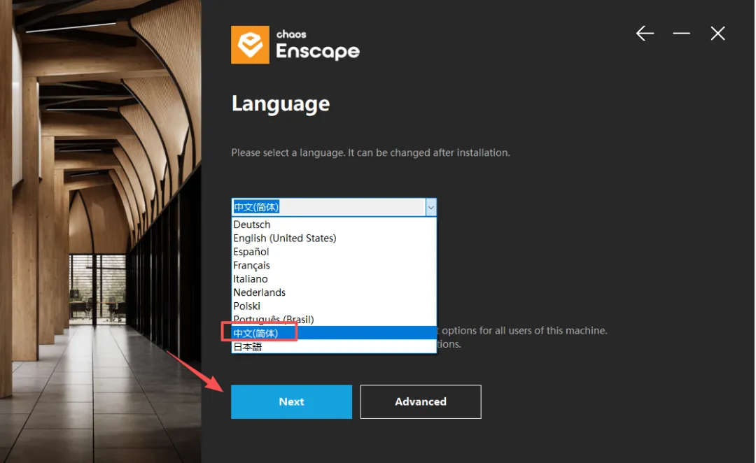 4、选择安装语言,根据需要选择中文简体,然后点击Next