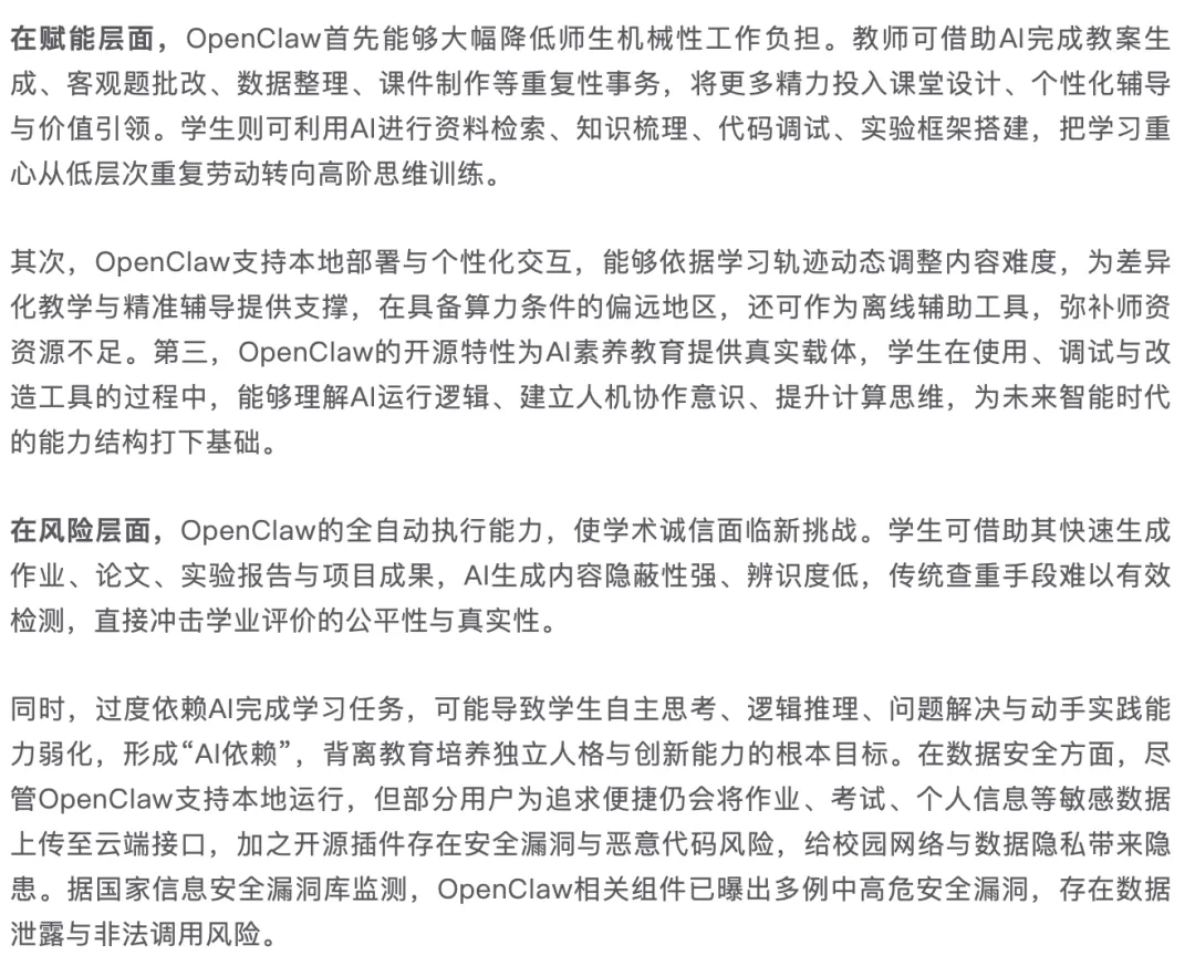 OpenClaw的开源性、本地部署特性及隐私保护优势,使其适合教育场景,既能提升教学效率,又能保障学生数据安全。不过,其应用需教师具备一定技术素养,且需注意避免学生过度依赖AI,确保AI辅助与教师引导相结合,实现技术与教育的深度融合。