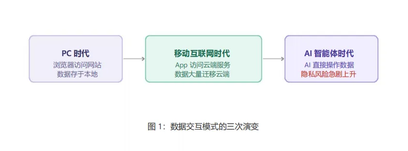 过去几十年,人类的数据交互模式经历了三次重大变化。在 PC 时代,数据主要存储在本地;进入移动互联网时代,数据大量迁移至云端;而在 AI 智能体时代,AI代理开始直接操作数据和服务,成为用户与数字世界之间的中间层。