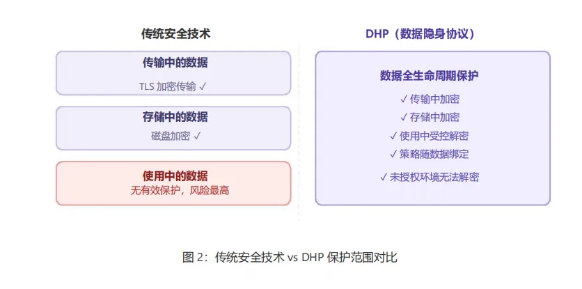 DHP(Data-object Hiding Protocol)是一种面向零信任架构的数据安全协议。传统安全技术主要保护传输中的数据(TLS等)和存储中的数据(磁盘加密等),但在AI时代,最大的风险往往出现在数据被使用的时候。