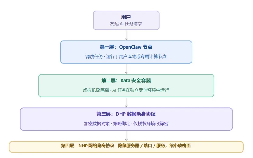 OpenClaw、Kata Container、DHP与NHP四者共同构成了一个面向AI时代的多层安全架构: