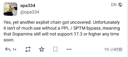关于 iOS 18.4 至 iOS 18.7 系统越狱可能性!opa334 越狱开发者迅速回应,很遗憾告诉你们,没有 PPL / SPTM 绕过方案,此漏洞肯定完成不了越狱,也就是说短期是不可能出现越狱支持,除非有人公开 PPL / SPTM 绕过方案。