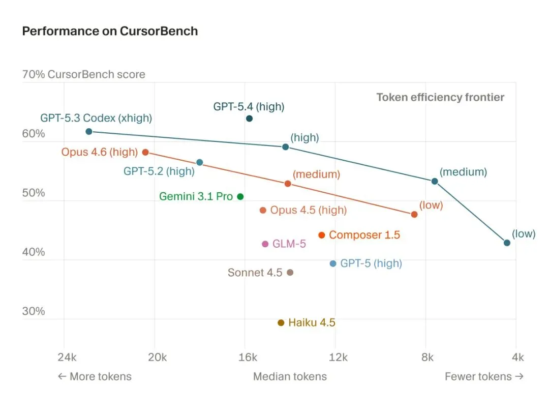 CursorBench采用线上+线下双轨评测:线下用真实用户请求构建任务,从正确性、代码质量、效率、交互等维度打分;线上则通过A/B测试追踪用户真实行为(如接受率、任务完成率)。结果表明:其排名与用户体验高度一致,且对前沿模型区分度更强。
