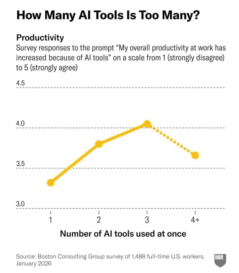 更严峻的是:高负荷AI使用者决策疲劳增加33%,重大错误率飙升39%,主动离职意愿从25%升至34%。 矛盾在于——AI分担重复劳动能减负,但“督工AI”却加倍耗神。破解之道不在少用AI,而在重构人机协作:①限用AI工具≤3个,明确监管边界;②强化人类高阶能力;③把注意力当稀缺资源统筹管理;④设计更“省心”的AI工具。
