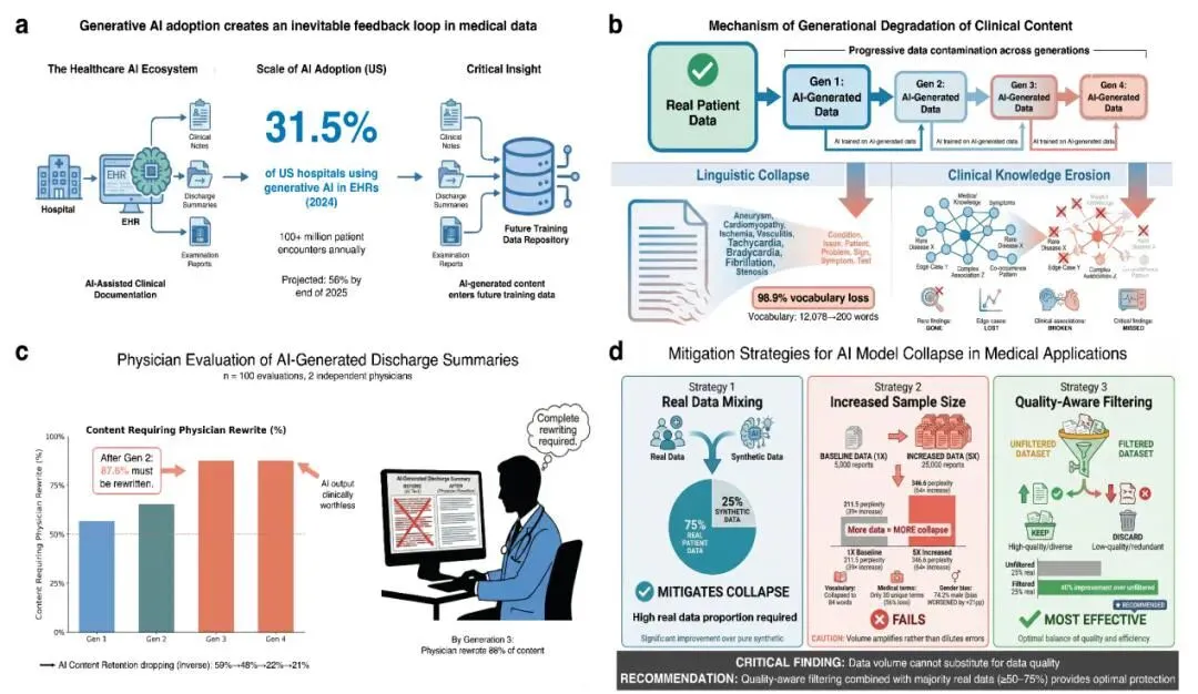 新加坡国立大学、哈佛、斯坦福等联合研究发现:仅经4代自我训练,放射报告词汇量锐减98.9%(从1.2万词降至约200词),独特医学术语减少66%,报告高度模板化;视觉-语言模型对危重病例误判率从13.3%飙升至40.3%,而模型自信度反而虚高。更严峻的是,合成数据污染导致罕见病特征丢失、人群多样性下降、诊断盲区扩大,且现有评估标准仅看语言流畅度,难以发现真实诊断能力退化。
