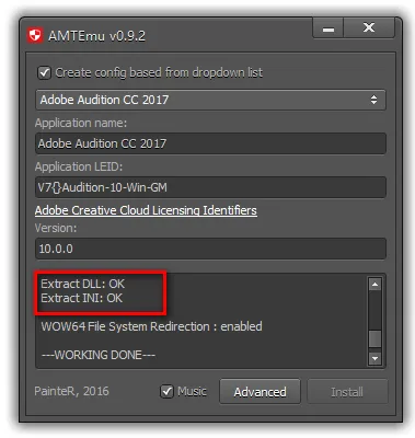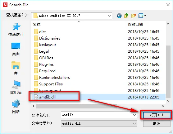 10.在弹出的文件资源管理器中,找到软件安装目录下的amtlib文件,点击“打开”。默认路径为:C:\ProgramFiles\Adobe\Adobe Audition CC 2017 ![]() 11.在注册机里看到OK的字样,说明破解成功