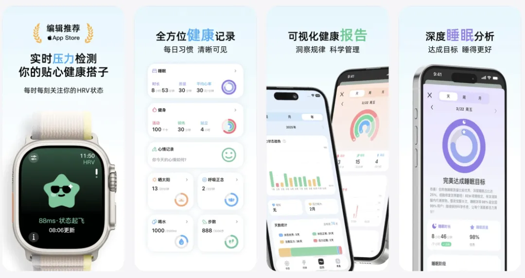 🪟 软件简介:一款结合 Apple Watch 使用的压力与健康习惯管理工具,可实时追踪 HRV 压力水平,通过图表和个性化报告帮助识别压力来源与情绪波动趋势。应用支持睡眠监测、步数和日常运动统计,可配合减压练习、睡前冥想和呼吸训练,帮助减轻焦虑、改善睡眠质量并养成更健康的生活习惯。