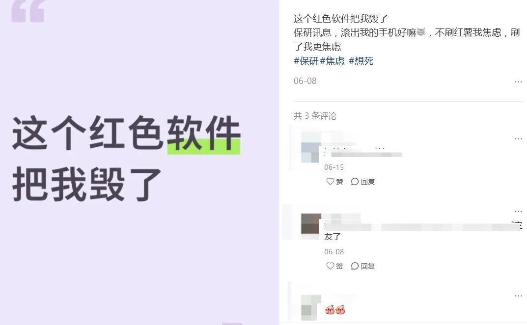 小红书的核心功能在于信息获取,然而你刷得越多,它越会推送让你停不下来的内容,导致保研er很容易陷入“刷经验贴→焦虑→刷更多经验贴”的恶性循环。