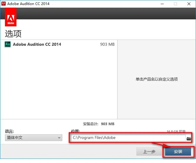 9.选择软件安装路径(默认安装路径为:C:\Program Files\Adobe),点击“安装”